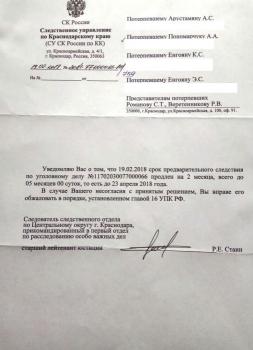 Следователь следственного отдела по расследованию особо важных дел СУ СК РФ по Краснодарскому краю Роман Стаин, расследующий дело о пытках четырех жителей Анапы в местном отделе полиции, продлил срок расследования до 23 апреля 2018 года. Подозреваемых в деле пока нет.