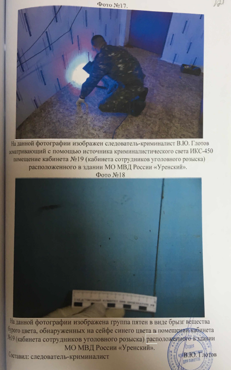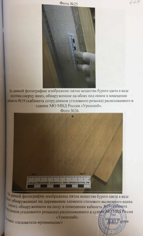 Что касается дела о незаконном применении физического насилия, в декабре 2018 года старший следователь по расследованию особо важных дел областного Следственного управления Михаил Благов обнаружил в кабинете ветлужского уголовного розыска многочисленные следы крови разных людей, а генетическая экспертиза установила, что среди них оказалась, в том числе, и кровь Якушева. Что примечательно — она осталась на той самой панели от ящика стола, а также на старых обоях, поверх которых были наспех наклеены куски новых.