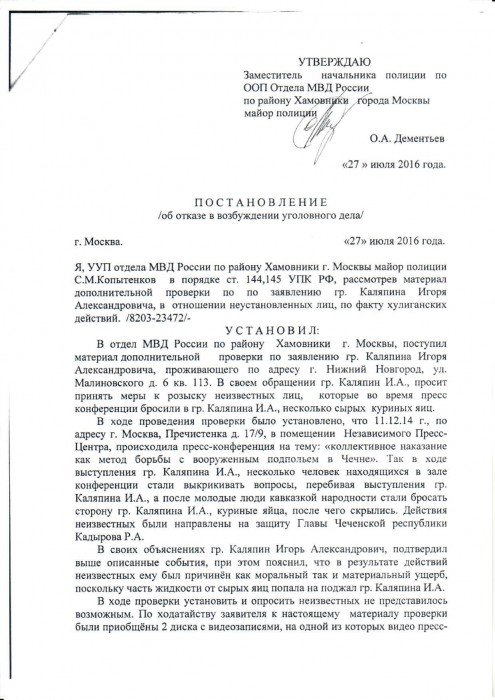 Такую оценку действиям «неизвестных» хулиганов «кавказской народности» дал майор московской полиции Копытенков. Добросовестно установив, что хулиганское нападение на Игоря Каляпина в декабре 2014 года в Москве было совершено по мотивам политической, идеологической ненависти, следователь, тем не менее, вопреки Закону, отказал в возбуждении уголовного дела. Причина такого парадоксального и явно незаконного решения, по мнению правозащитников, кроется в описательной части постановления – в ней следователь установил, что хулиганские действия были направлены на «защиту Главы Чеченской республики Кадырова Р.А.».Напомним, 11 декабря во время пресс-конференции «Коллективное наказание как метод борьбы с вооруженным подпольем в Чечне», которая проходила в Москве в Независимом пресс-центре, несколько сторонников Рамзана Кадырова забросали яйцами председателя Комитета против пыток Игоря Каляпина. Кроме Каляпина в пресс-конференции принимали участие глава Комитета «Гражданское Содействие» Светлана Ганнушкина, специальный корреспондент «Новой Газеты» Елена Милашина и руководитель Правозащитного Центра «Мемориал» Александр Черкасов.