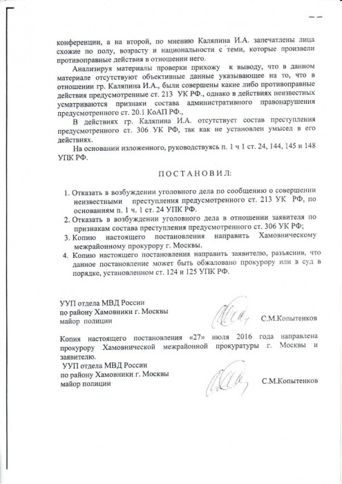 Последнее «отказное» постановление участковый уполномоченный Хамовнического отдела полиции господин Копытенков вынес еще 27 июля прошлого года. Однако ознакомиться с этим постановлением удалось после нескольких жалоб лишь в марте года текущего – уведомлять Каляпина инициативно и своевременно о принятом решении майор Копытенков почему-то не спешил.