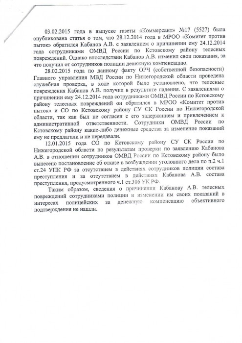 Нижегородская полиция просит Комитет против пыток опубликовать заведомо ложные сведения. Наша организация получила письмо от начальника оперативно-разыскной части собственной безопасности ГУ МВД России по Нижегородской области подполковника Стрельникова с просьбой опубликовать на сайте Комитета против пыток опровержение. Речь идет о ситуации вокруг нижегородца Александра Кабанова, который сначала обвинил полицейских в избиении и фальсификации правонарушения, а позже отказался от своих показаний, причем, по нашей информации, за это мужчина получил от этих сотрудников МВД денежную компенсацию. Так вот господин Стрельников пишет, что, мол, проведенная ведомством проверка не нашла объективного подтверждения указанных сведений, Кабанов вроде как сам упал, да оговорил полицейских, так как был не согласен со своим задержанием. В связи с этим товарищ подполковник просит опубликовать на нашем сайте присланное в приложении к письму опровержение.