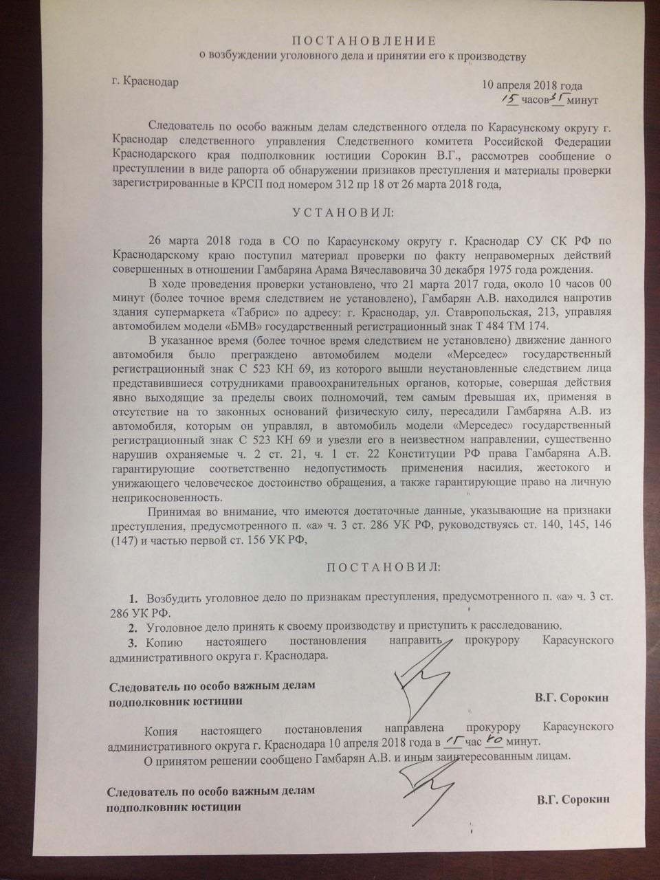 10 апреля 2018 года правозащитникам все-таки удалось добиться возбуждения уголовного дела по факту превышения должностных полномочий в отношении Арама Гамбаряна. Возбудивший это дело следователь по особо важным делам Владимир Сорокин установил, что Гамбарян был похищен на улице неустановленными сотрудниками правоохранительных органов и увезен в неизвестном направлении на автомобиле «Мерседес» с регистрационным номером С 523 КН 69.