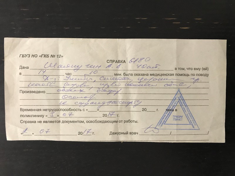 В Комитет по предотвращению пыток за юридической помощью обратился житель поселка Первое Мая Балахнинского района Нижегородской области Алексей Шляпугин. Он сообщил, что 26 июня этого года был избит сотрудниками полиции при задержании в собственном гараже. Как утверждает Алексей, в результате избиения он получил перелом ребра, множественные ушибы и ссадины. Юристы Комитета по предотвращению пыток начали общественное расследование. В своем объяснении правозащитникам Алексей сообщил, что 26 июня этого года около полудня он приехал к своему гаражу – там уже находился его приятель, который использует это помещение для ремонта компьютерной техники. По словам Шляпугина, он собирался выгрузить в гараж инструменты и поехать по своим делам, однако в этот момент на него набросилось четверо мужчин в гражданской одежде.
